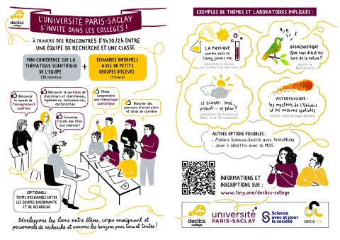 Dans le cadre de sa politique de sensibilisation des sciences auprès des jeunes, en particulier des filles, l’Université Paris-Saclay, soutenue par le Cercle FSER, a mis en place le dispositif Declics Collège. Il consiste en une rencontre d’1h30 à 2h entre une classe de collège et une équipe de recherche disciplinaire. L’intervention débute par une mini-conférence (30 min) sur la thématique scientifique de l’équipe et est suivie par des échanges informels avec de petits groupes d’élèves pendant une heure.